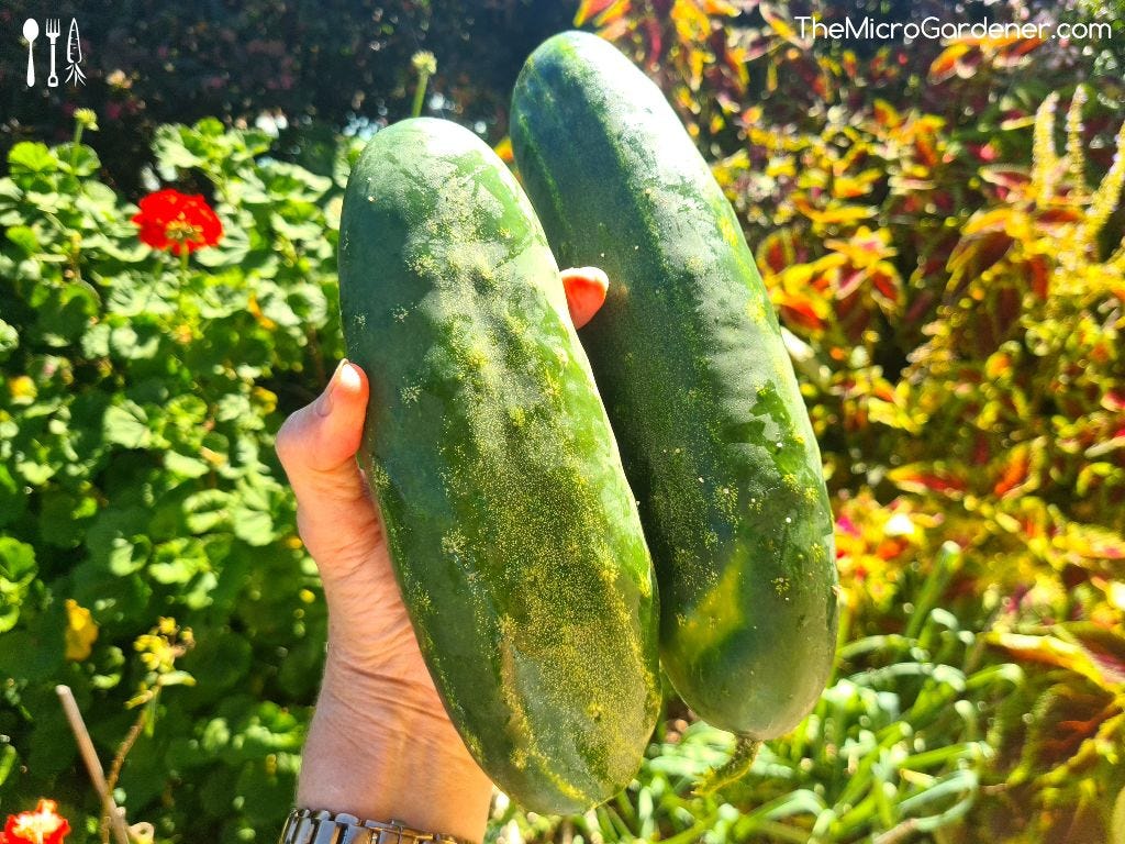 This morning, I thought I'd have to (eek!) buy a cucumber, assuming mine were well on their way to becoming compost candidates. But a voice in my head said, ‘Go check anyway.’ To my surprise and delight, I found two huge cucumbers ready for harvesting!